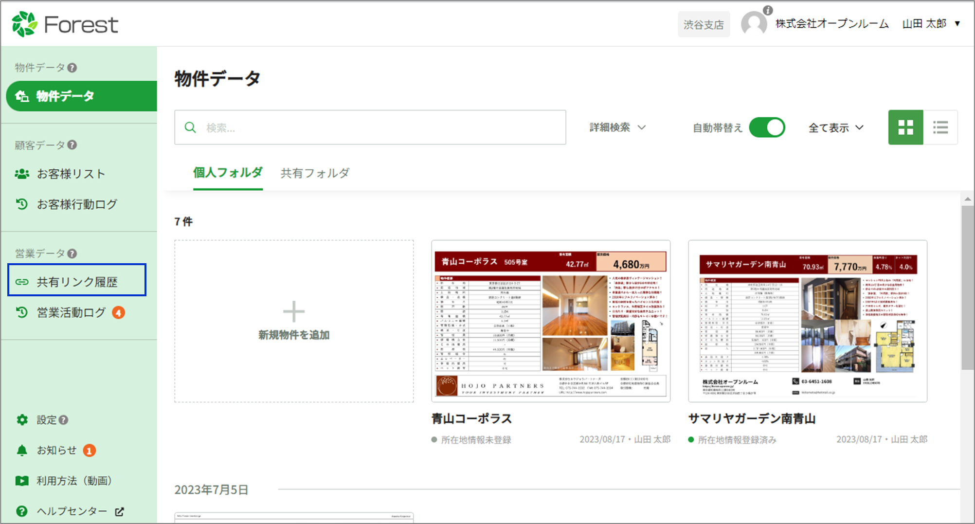 【STANDARD/PRO】共有リンク履歴から閲覧数やURLを確認しましょう 2023年12月04日 06:25 更新 1.左側メニューより「共有リンク履歴」を選択します。 2.共有リンク履歴では、共有済みの物件名やリンクの閲覧数を確認したり、URLのコピーができます。 コメント 0件のコメント サインインしてコメントを残してください。